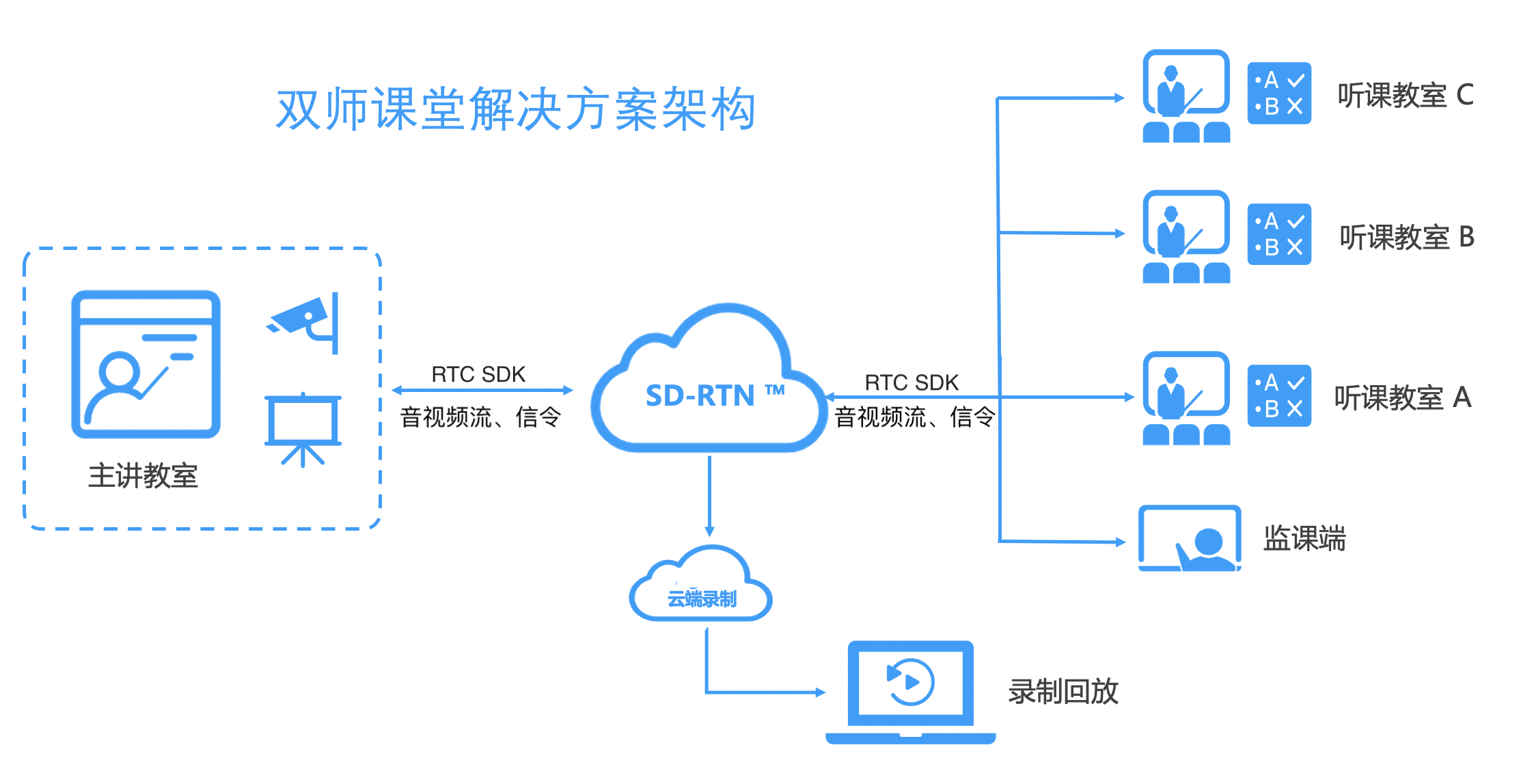 针对国内经济较发达地区和偏远地区教育资源分配不均、不同学校间各学科和教师的教学水平存在差异以及教学机构的不同校区间教学水平等痛点,声网推出双师课堂解决方案,实现高效复用名校和名师资源,促进教育资源均衡。
